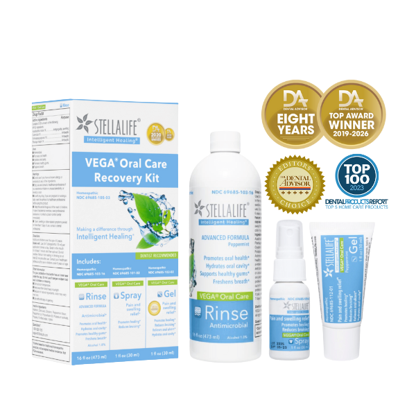 The patented StellaLife® VEGA® Oral Care Recovery Kit provides pain relief and has been clinically found to speed up healing. Dental professionals have found it effective in the pain management and recovery following dental surgical procedures. The 16 active ingredients contain analgesic (pain relief), anti-inflammatory (swelling relief) and antibacterial properties. It is easy to use when following the instructions on the label.