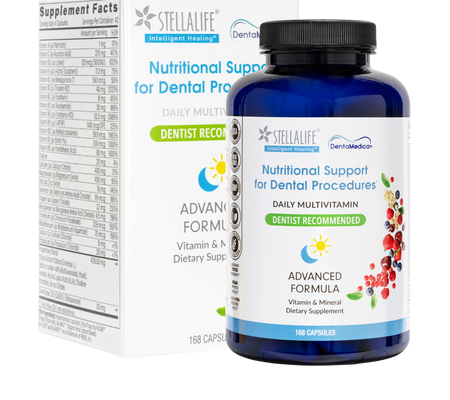 StellaLife® DentaMedica™ is a comprehensive dental recovery support program to promote the body’s healing process before and after surgery. The 6-week vitamin and mineral dietary supplements supply provides essential nutritional supplements designed to enhance antioxidant and vitamin levels. Great as a daily multivitamin.*