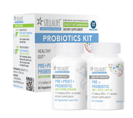 True to our mission to improve lives, we present the StellaLife® Pre+Post+Probiotic Kit (60 day supply) to you. Combined oral and gut probiotics give you a complete microbiome solution. In one kit, you get an opportunity to restore your oral and gut flora to health. *Winner of Dental Products Report Top 100 Award: Top 5 Home Care Products of 2023!