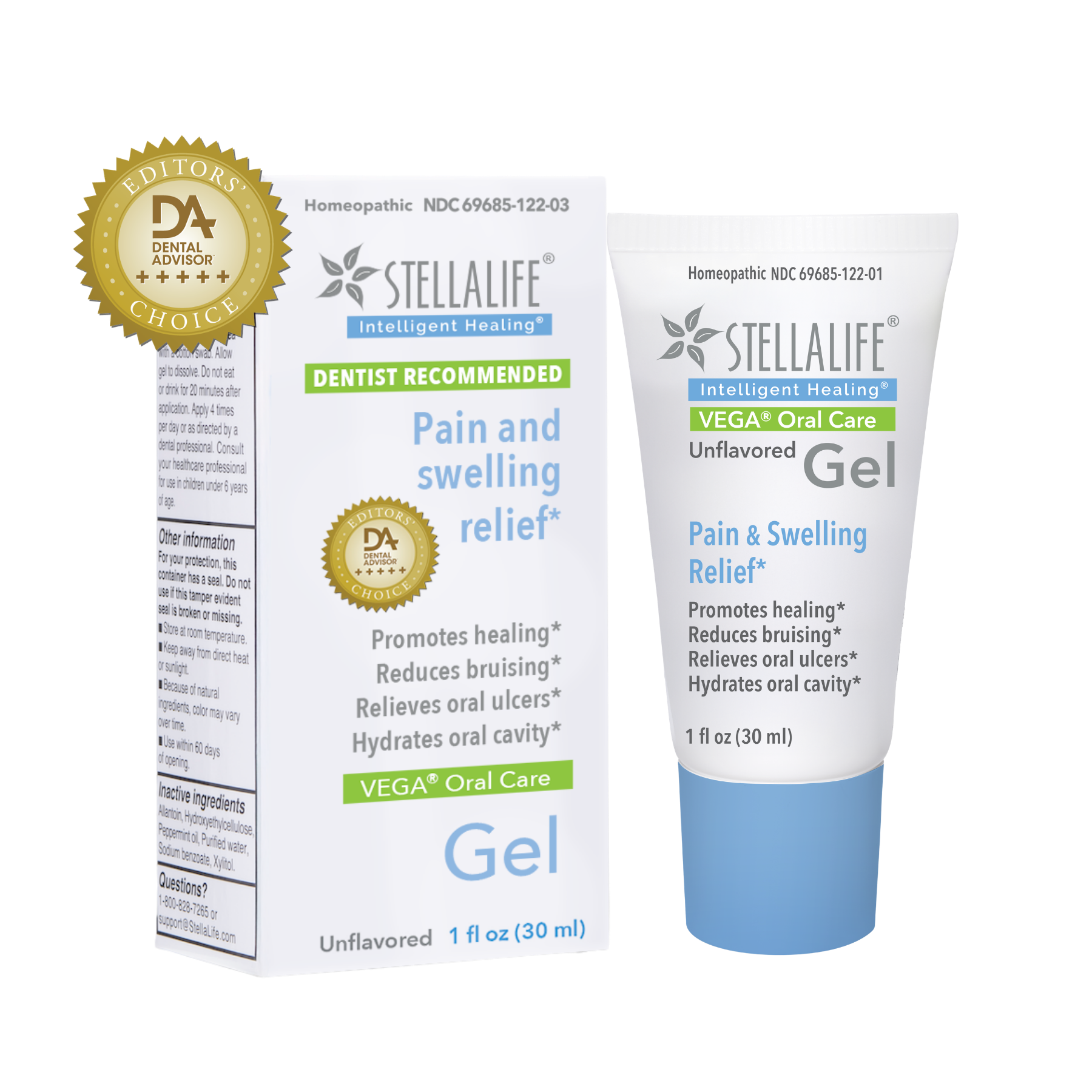 "Two StellaLife products were evaluated by the DENTAL ADVISOR. Both products are rated very highly, with StellaLife VEGA Oral Gel really shining for several aspects. Due to its unique properties, the product was awarded Editors' Choice, the highest distinction given by the DENTAL ADVISOR." - - The Dental Advisor