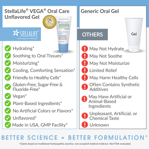 StellaLife® VEGA® Oral Care Unflavored Gel is a patented innovative technology formulated to relieve discomfort after dental procedures and reduce the need for opioids and steroids (StellaLife® Gel & Rinse).
